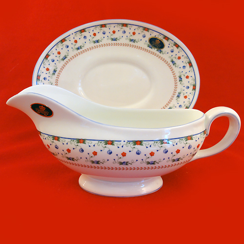 NEW NEVER USED Aynsley dinnerware Ashbourne, Gravy Boat 4" tall, 8.75" long, 3" at the lip, Stand 8.25" long, 3.25" wide, bone china hand painted in England, no gold or platinum micro wave safe