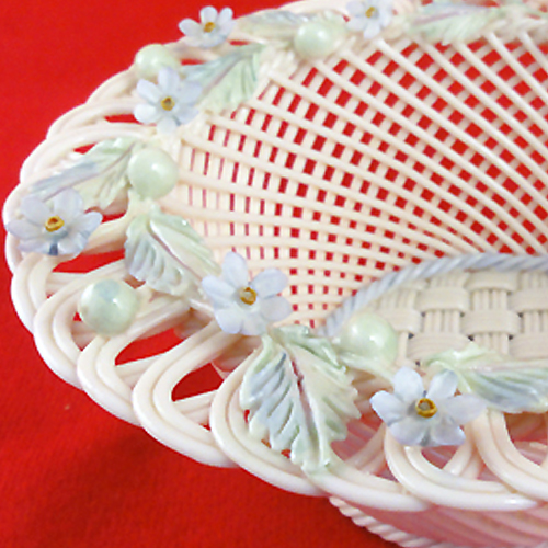 NEW IN BOX NEVER SOLD OR USED Belleek giftware Woven Basket with Blue-Forget-Me-Not Flowers & Berries, with green leaves, Bowl made in Ireland and hand painted, translucent perian porcelain, basket weave design, circa 1980-89 4th period markings
