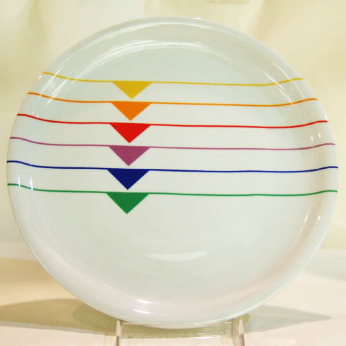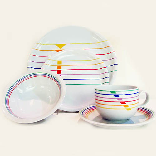 NEW NEVER USED Block Spal dinnerware Sextet, made in Portugal, named after the Rainbow Coloured musical notation that is the design of the dinnerware, 5 Piece Place setting Dinner Plate, Cereal Bowl, Bread & Butter, Cup & Saucer, Porcelain