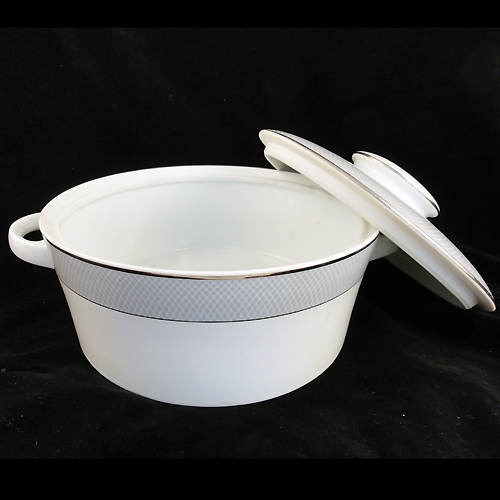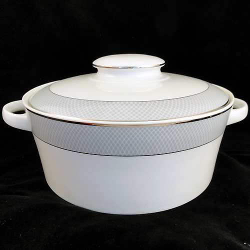 NEW NEVER USED Block Spal dinnerware Grey Dawn, Covered Vegetable Bowl, 6" tall, 11" wide, 9.5" diameter at the lip, porcelain made in Portugal, Platinum Band