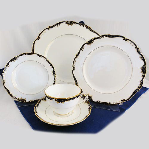 NEW NEVER USED Coalport dinnerware, Admiral Cobalt 5 piece Place Setting, Dinner 10.75" diameter, Salad 7.75", Bread & Butter 5.75", Cup 2.5" tall 3.5" at the lip, Saucer 5.5", bone china hand painted in England, cobalt and gold trim.