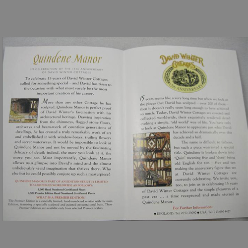 NEW IN BOX David Winter Cottage Quindene Manor was modelled in the John Hine Studios and is of hand painted porcelain. It was celebrating 15 years of David Winter. It stands 12.5 inches tall, 8.5 inches long and 6.5 inches wide.LIMITED EDITION OF 3000