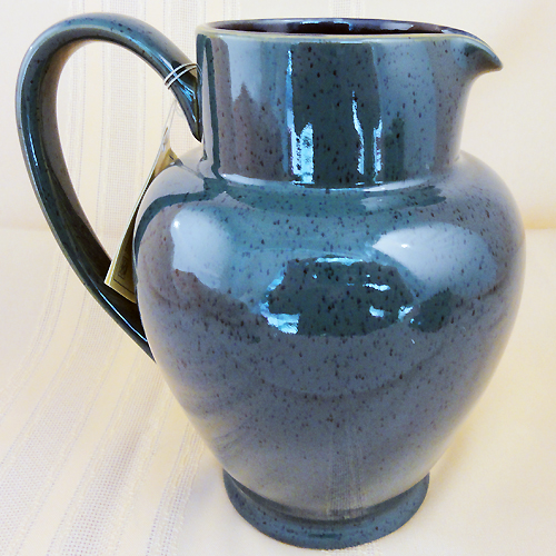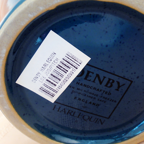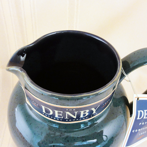 NEW NEVER USED Denby dinnerware Harlequin JUG Pitcher Blue Inside / Green Outside, 7.5" tall, 7.25" wide, 4" at the lip, base 3.5", Stoneware hand formed, painted, oven, dishwasher and freezer proof, made in England