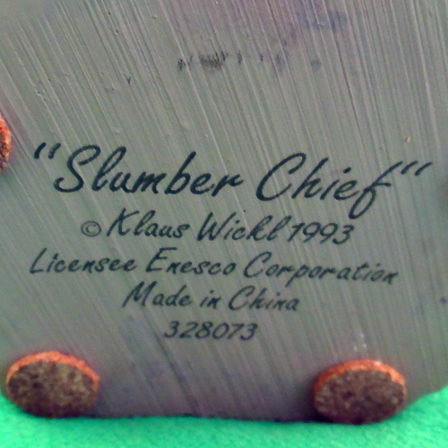 NEW Klaus Wickl's Gnome figurine Slumber Chief 5" tall, 5" wide, 3.5" long, hand painted, made in 1993, distributed by Enesco, made in China model number 238073