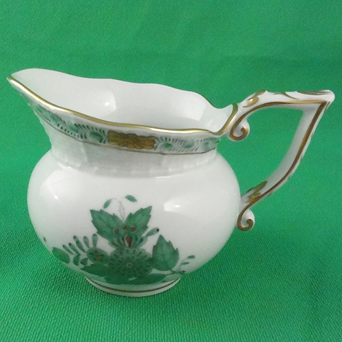 NEW NEVER USED Herend dinnerware Chinese Bouquet Green, Creamer, 3.5 inches in tall, 5 inches wide and 3.25" at the lip, model number 642/AV, hand painted, porcelain made in Hungary Osier shape