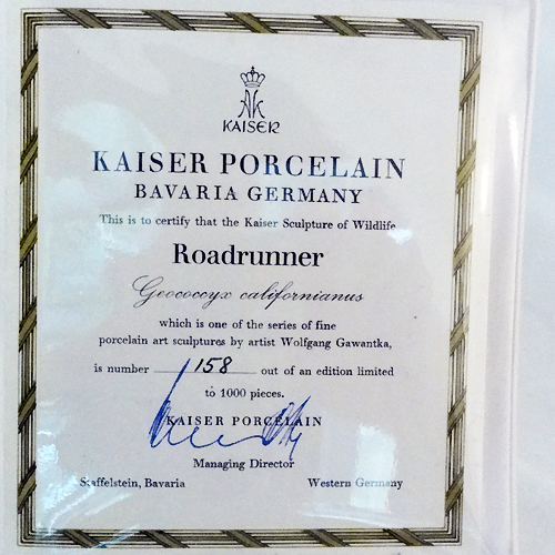 NEW NEVER SOLD Kaiser figurine Roadrunner by Wolfgang Gawantka 9 inches high with Plinth included, 13.5 inches long and 4.5 inches tall, porcelain hand painted in Germany, comes with certificate also