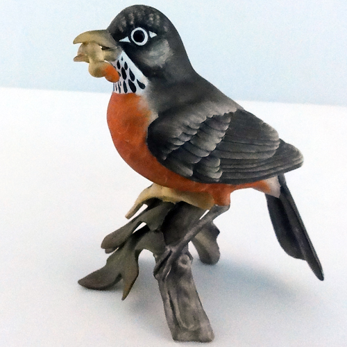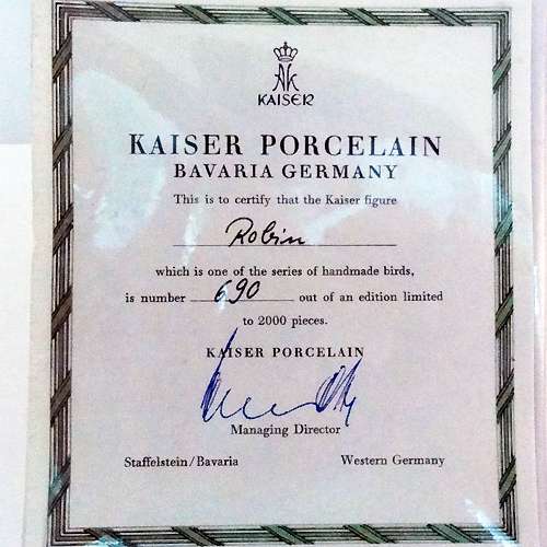 NEW NEVER SOLD Kaiser figurine Robin 5 inches high, 5 inches long, 3.5 inches wide, porcelain hand painted in Germany, comes with certificate