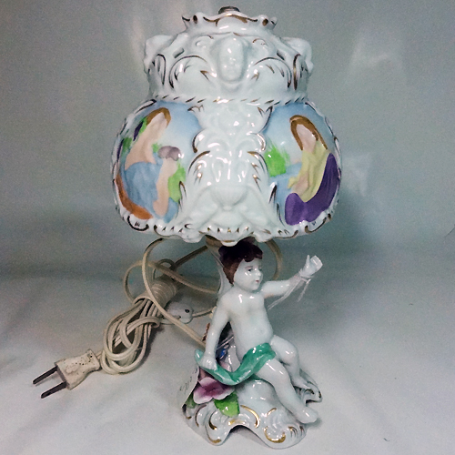 VINTAGE CIRCA PRE WWII Dresden porcelain Lamp with Shade, Male figure at base, 10 inches high, 7 inches in diameter, Electrical with transparent panels which light up with bulb on, Original hand painted made in Pre WWII Germany