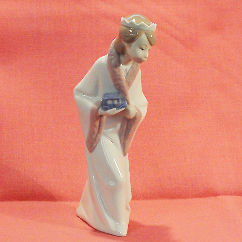 Lladro figurine Gaspar King 04674 is porcelain hand painted in Spain, he is presenting a car to baby Jesus. He is 8 inches tall