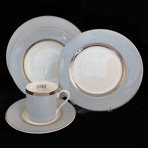 NEW NEVER USED Mikasa dinnerware Avante Silver, model CH202, 5 Piece Place Setting, Dinner 10.75" diameter, Salad 8.25", Rim Soup 8.8" diameter, 1.5" tall, Cup 2.9" tall, 2.9" at the lip, Saucer 6.25" diameter, Bone China made in Japan