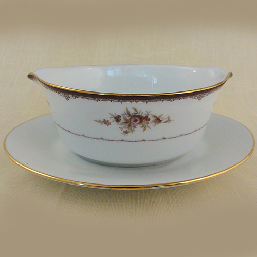 NEW NEVER USED Noritake dinnerware Bordeaux, Gravy Boat with Attatched Stand 9" long,3" tall, 6" wide, 24kt gold band, bone china made in Phillipines