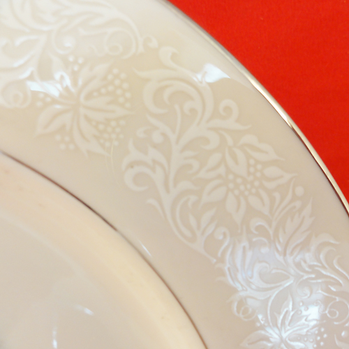 NEW NEVER USED Pickard dinnerware, Brocade, Creamer, 3.5" tall, 3.5" diameter, 4.75" from spout to handle, Hand painted porcelain, White on white, Platinum trim, Designed in the USA.