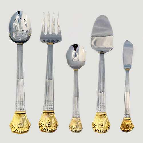 NEW NEVER USED Retroneu stainless flatware, Avignon Gold, 5 Piece Hostess Set, Pierced Berry Spoon 9.5", Cold Meat Fork 9.5", Pie Server 10.5", Butter Knife 7.25", Sugar Spoon 6.25", 18/8 Stainless Steel.