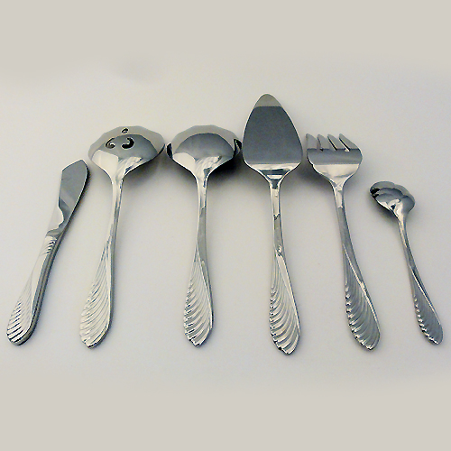 NEW NEVER USED Retroneu stainless flatware, Coquille, 6 Piece Hostess Set, Stainless, Berry Spoon 9", Pierced Berry Spoon 9", Serving Fork 8.75", Pie Server 10.75", Butter Knife 7", Sugar Spoon 6.25", 18/8 Stainless Steel.