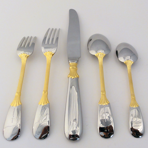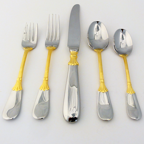 NEW NEVER USED Retroneu stainless flatware, Prince of Wales Gold, 5 Piece Place Setting, Dinner Knife 9.5", Dinner Fork 7.5", Salad Fork 7", Soup Spoon 7.25", Teaspoon 6.25", 18/8 Stainless Steel.