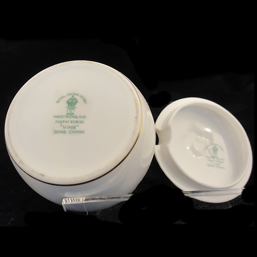 NEW NEVER USED Royal Crown Derby dinnerware Vine 5 piece place setting,includes dinner 10.5",salad 8.25", bread & butter 6.25", cup 2.75" tall, 3.75" at the lip, saucer 5.6" diameter, bone china hand painted, decorated with 24kt gold, made in England