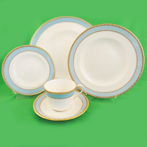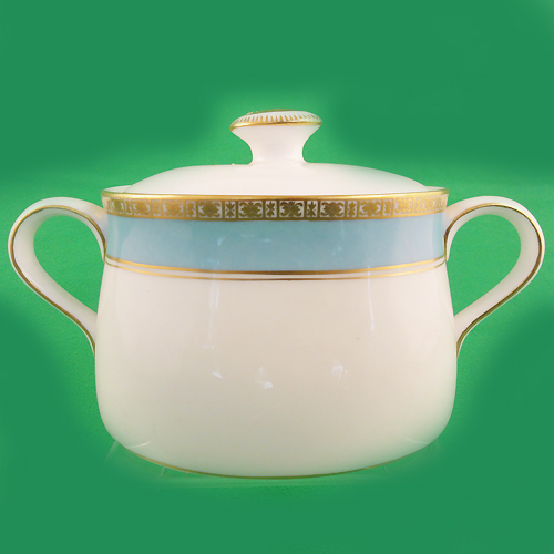 NEW NEVER USED Royal Crown Derby dinnerware Fifth Avenue Covered Sugar Bowl 4" tall, 6" wide, 3" at the lip, bone china hand decorated in England, robin egg blue with 24kt gold trim