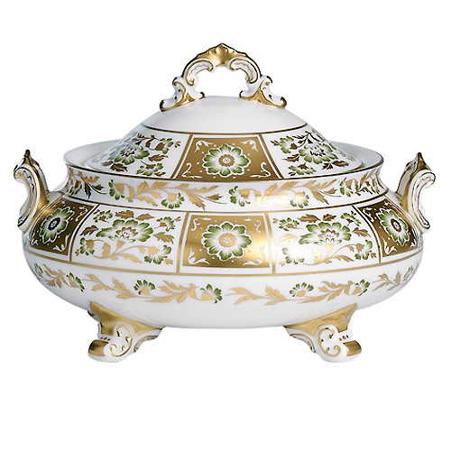 NEW NEVER USED Royal Crown Derby dinerware Green Panel Covered Vegetable 9 inches diameter, bone china hand painted 22kt gold England, 6.25 inches high,9 inches in diameter with 5.25 inch opening at rim