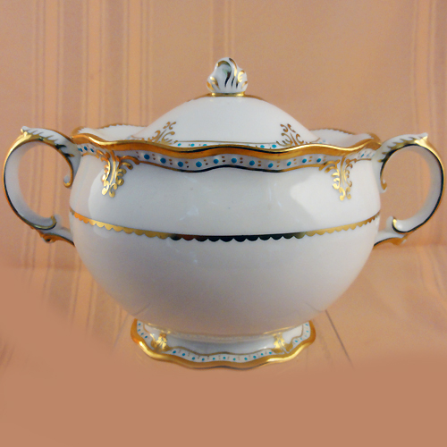 NEW NEVER USED Royal Crown Derby dinnerware Lombardy Covered Sugar Bowl 4.75" tall, 3.5" at the lip, 7" wide, 24kt gold trim, bone china hand decorated in England, XLI