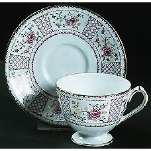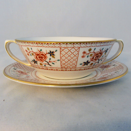 NEW NEVER USED Royal Crown Derby dinnerware Lucienne, Cream Soup 3.5 inches tall and 4 inches in diameter, Stand 6 inches in diameter, bone china hand painted in England