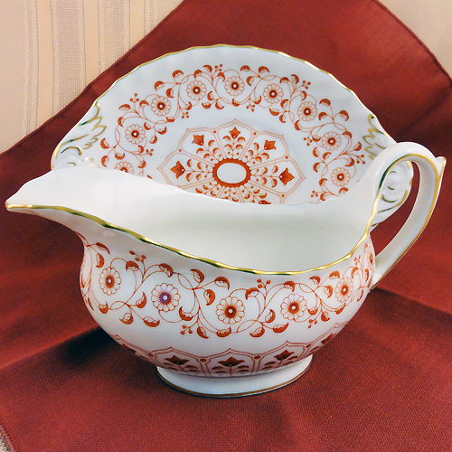 NEW NEVER USED Royal Crown Derby Dinnerware Rougemont Gravy Boat 4.5" tall, 8" long, 3.5" wide, Stand 8.25" long, 5.6" wide, hand painted Bone China gilded with 24kt gold, made in England, Iron Red, XXXV & XXX