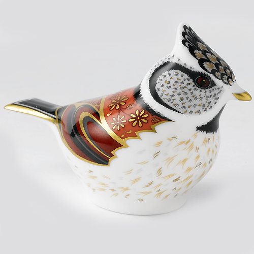 NEW IN BOX This Royal Crown Derby figurine Crested Tit is also a paperweight, bone china, 2.5 inches tall, hand painted finished in 22ct gold, and made in England,has a gold stopper in bottom to open and fill figure with sand for weight, designed by Loiuse Adams and Mark Delf