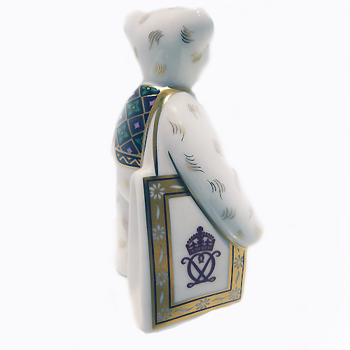 NEW IN BOX This Royal Crown Derby figurine paperweight Shopper Teddy Bear miniature collection, bone china, 3.75 inches tall, hand painted finished in 22ct gold, and made in England