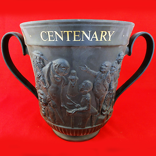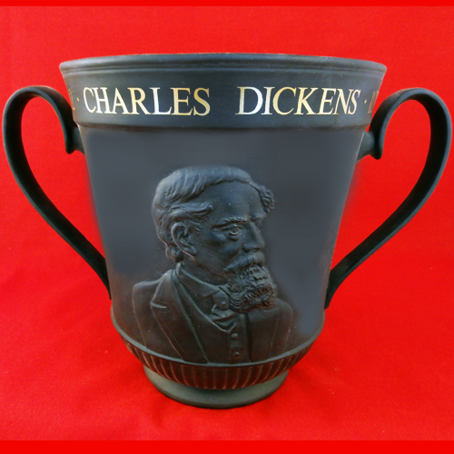 NEW IN BOX Royal Doulton Loving Cup Charles Dickens Centenary edition, limited edition of 500 we have editions 52 and 404, it stands 8.25" tall and 11" wide and 7.25" at the lip, hand painted black basalt with 24kt gold, made in England
