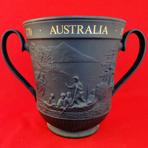 NEW IN BOX Royal Doulton Loving Cup Captain Cook Landing in Australia 1770-1970 bicentenary edition, limited edition of 500 this one is number 179, it stands 8.25" tall and 11" wide and 7.25" at the lip, hand painted black basalt with 24kt gold, made in England