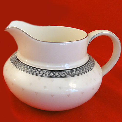 NEW NEVER USED Royal Doulton dinnerware Burlington Gravy Boat 4" tall, 6" long, 4.75" wide, bone china hand decorated, Platimum Trim, made in England