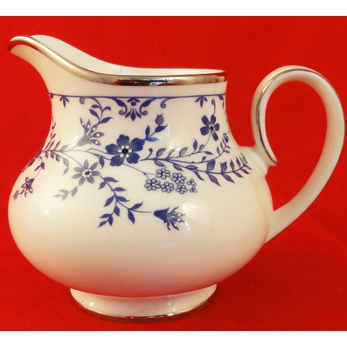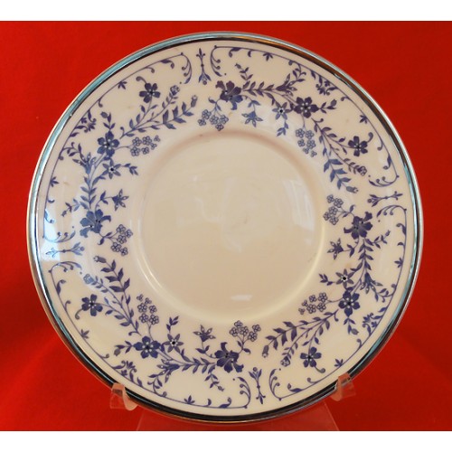 NEW NEVER USED Royal Doulton dinnerware Sapphire Blossom,Gravy Boat 4" tall, 6.5" long, Stand 6.75" diameter, bone china Platinum Band, made in England