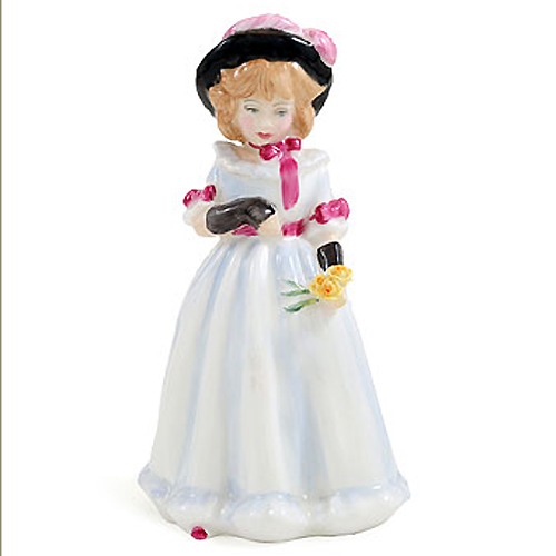 Royal Doulton figurine Sharon HN 3047 designed by Pauline Parsons in 1984 and in production until 1975. She stands 5.5 inches tall and is a little girl who is bone china hand painted in England