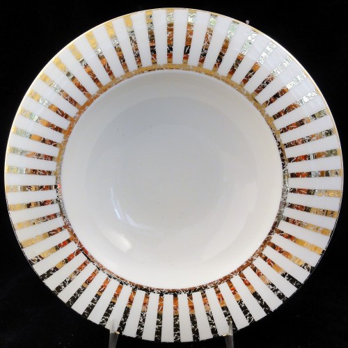 NEW NEVER USED Royal Doulton Fusion Fine China Jive Gold 4 Piece Place Setting Salad 8.8" Soup 8.8" tall, 1.8" tall, Cup 3.25" tall, 3.5" at the lip, Saucer 6.25" fine everyday china, oven, dishwasher, microwave and freezer safe. Made in England chip resistant.