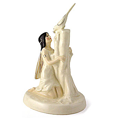 Royal Doulton figurine The Magpie Ring HN2978 was designed by Adrian Hughes in 1983 and was in production until 1986. She stands 8 inches tall and is one of the Enchantment Series. She is bone china hand painted in England.