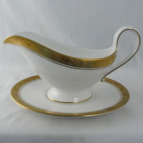 NEW NEVER USED Spode dinnerware Manderin Gold Gravy Boat 5 inches tall, 8.5 inches long, 3 inches at base, Stand is 8.3 inches long, bone china hand painted with 22kt gold made in England
