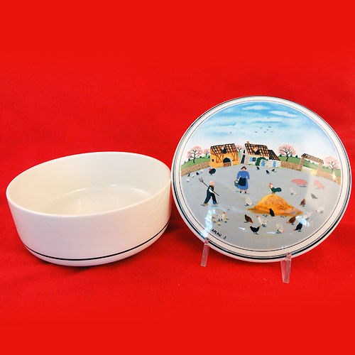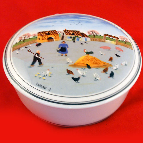 NEW NEVER USED Villeroy & Boch dinnerware NAIF DESIGN, Candy Box 2" tall, 3" diameter, Scene with a Village and Chickens, This is dishwasher and microwave safe. It is made out of vitro porcelain and is made in Luxembourg, Designed by French artist Gerard Laplau