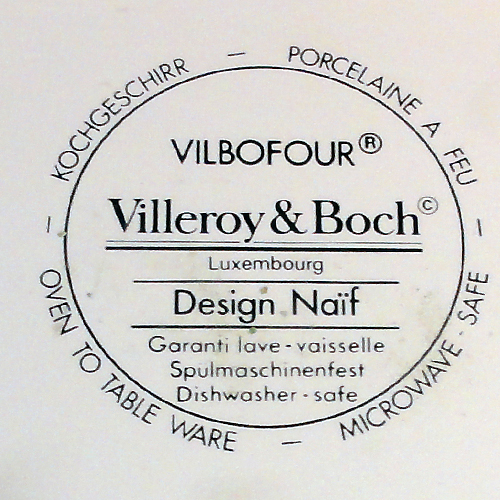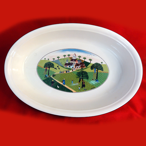 NEW NEVER USED Villeroy & Boch dinnerware NAIF DESIGN, Oval Baking Dish, 2.75" tall, 14" long, 9.5" wide, Scene is apple picking, This is dishwasher safe, oven to table, It is made out of vitro porcelain and is made in Luxembourg, Designed by French artist Gerard Laplau