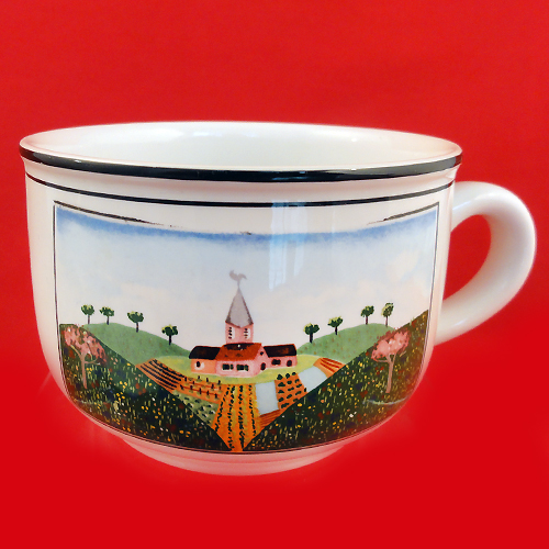 NEW NEVER USED Villeroy & Boch dinnerware NAIF DESIGN, Cup & Saucer Set, Cup is 2.25" tall and 3.5" diameter, Saucer is 5.75" diameter, Scene is a a church spire, This is dishwasher and microwave safe. It is made out of vitro porcelain and is made in Luxembourg, Designed by French artist Gerard Laplau