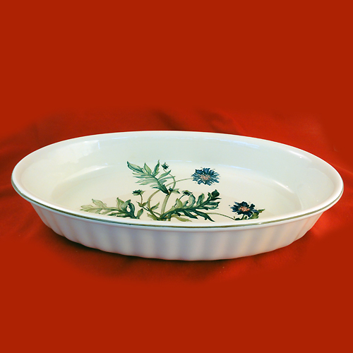 NEW NEVER USED Villeroy & Boch dinnerware Botanica, Oval Baking Dish which stands 1.5" tall, 16.25" long and has a width of 10.5". This piece is porcelain made in Luxembourg. It is also freezer to oven and microwave safe. Perfect condition and new in box. The box says 17".
