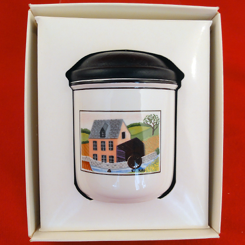 NEW NEVER USED Villeroy & Boch dinnerware NAIF DESIGN, Covered Spice Jar, 3.25" tall, 2.5" diameter, dishwasher and microwave safe, Scene is a water mill, dishwasher safe, It is made out of vitro porcelain and is made in Luxembourg, Designed by French artist Gerard Laplau