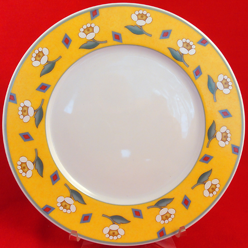 NEW NEVER USED Villeroy & Boch dinnerware Switch 1 AVA YELLOW, Salad Plate. This plate has a diameter of 8.25". it has a wide band of yellow with small white flowers and a white center. This plate is dishwasher safe, made out of porcelain and is made in Germany.