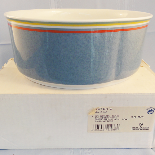 NEW NEVER USED Villeroy & Boch dinnerware Switch 1, Round Open Vegetable Bowl. This item is 4" tall and is 9.8" in diameter, it is blue with red and yellow lines at the top. This plate is dishwasher safe, made out of porcelain and is made in Germany.