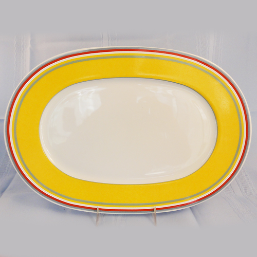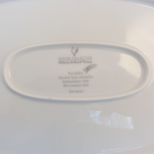 NEW NEVER USED Villeroy & Boch dinnerware Switch 1, Oval Platter. This item is 13.75" in length and is 9.25" wide,with a white center and a wide yellow band. This plate is dishwasher and microwave safe, made out of porcelain and is made in Germany.