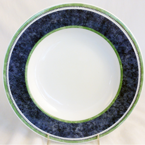 NEW NEVER USED Villeroy & Boch dinnerware Switch 3 COSTA Rim Soup Bowl. This item is 9" in diameter with a white center and a wide blue band at the edge. This plate is dishwasher and microwave safe, made out of porcelain and is made in Germany.
