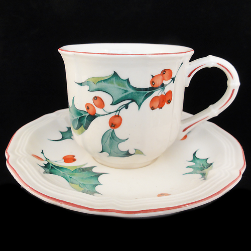 NEW NEVER SOLD Villeroy & Boch dinnerware, Holly, Demi Cup & Saucer Set, Cup is 2.25" tall, 2.75" diameter at the lip and 3.5" from the lip to the handle, Saucer is 5" in diameter, Dishwasher safe, Vitro Porcelain, Made in Luxembourg.