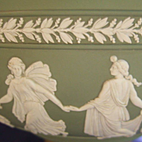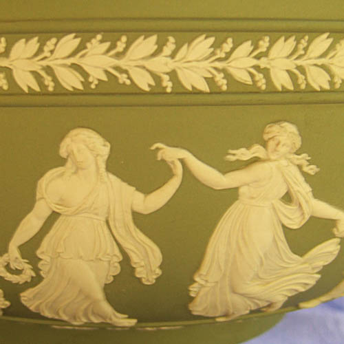 NEW NEVER USED Wedgwood Jasperware Dancing Hours Bowl, hand made in England, Green and White Jasperware, It is large and covered with the dancing hours figures, It was made in 1965 and can be used for food service or as a centre piece bowl 4" tall and 10" diameter at the rim, 3.5 pounds before packing