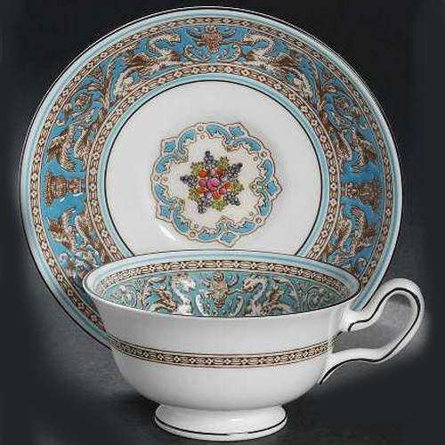 Wedgwood dinnerware Florentine Turquoise 5pc.with medallion in centre on plates, This is bone china hand decorated made in England, Included are the dinner,salad,bread & butter, Peony CUP and saucer