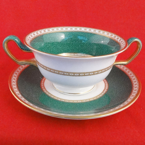 NEW NEVER USED Wedgwood dinnerware Ulander Green Cream Soup & Stand gold trim bone china hand painted made in England