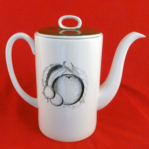 NEW NEVER USED Wedgwood dinnerware Susie Cooper designed Black Fruit Coffee Pot Round.This is bone china hand decorated made in England. It is 8.5 inches high and 9.5 inches wide.