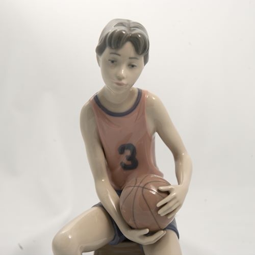 NEW IN BOX NEVER USED OR SOLD Lladro Basketball Player figurine, hand painted porcelain, 9 inches tall, made in Spain, He is model number 6091,Boy sportsman BOX IS A LITTLE WORN